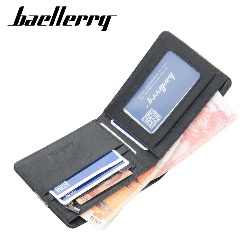 The Baellerry wallet is a stylish and fashionable accessory for men. Made from genuine cow leather, it features a sleek and smooth surface that adds to its overall appeal. The wallet has a short length and a weight of 102g, making it lightweight and easy to carry. The lining of the wallet is made from polyester, which is durable and ensures the contents are protected.  The wallet has a height of 2cm, a width of 9cm, and a length of 12cm. It has a solid pattern and a no-zipper closure type. The interior of the wallet is designed to cater to the needs of the user with multiple slots for cards, compartments for notes and coins, and a photo holder. It also features an interior zipper pouch for added security.  The wallet has a stylish and fashionable design with no decoration, making it suitable for various occasions. The Baellerry wallet is ideal for those looking for a reliable and functional wallet with a touch of style.